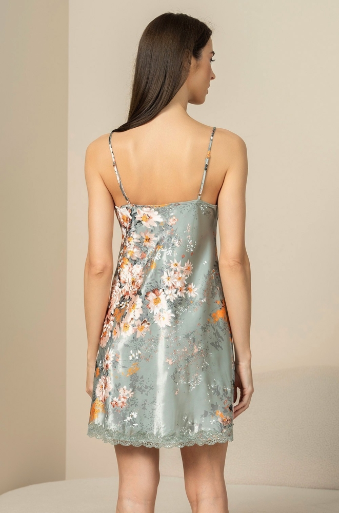 Короткая сорочка Mia-Amore без подреза на тонких бретелях выполнена из принтованной смесовой ткани. Лиф сорочки и низ декорированы кружевом. Состав: 70% натуральный шелк, 25% полиэстер, 5% эластан