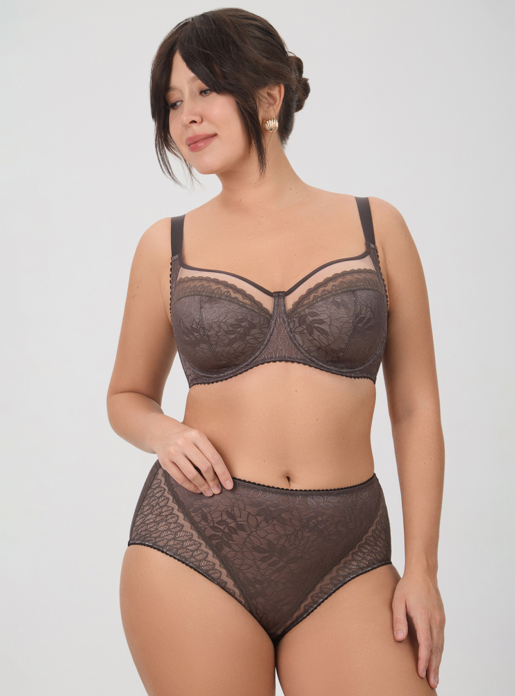 Бюстгальтер с мягкой чашкой на каркасах выполнен из эластичного кружевного полотна, кружева и неэластичной сетки Закрытая чашка и высокая центральная деталь надежно фиксируют грудь Особый крой чашки с боковой поддержкой собирает грудь с боков и направляет ее к центру Нижняя деталь чашки усилена подкладкой из трикотажного полотна Боковые детали на подкладке из функционального полотна усилены стержнями Изделие декорировано изящным бантом с подвеской Состав ПА 85% ПУ 15%
