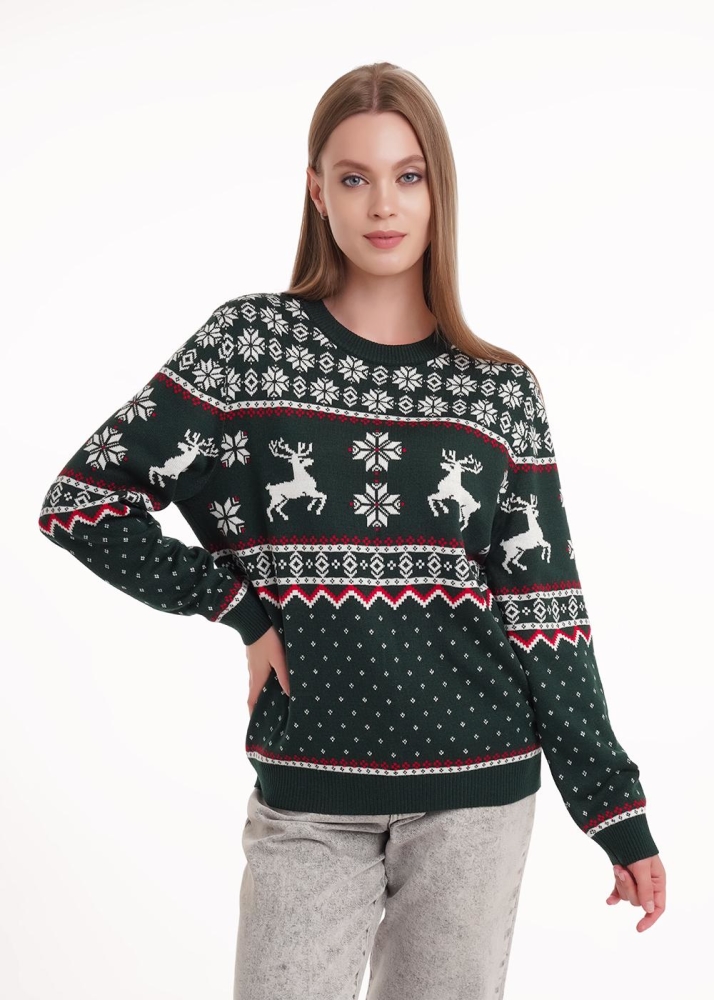 Описание: Вязаный джемпер прямого силуэта, жаккардового переплетения из акриловой пряжи. Втачной длинный рукав. Округлая горловина с бейкой. По низу изделия и рукавов манжеты. Состав: 100%Акрил Страна: РОССИЯ