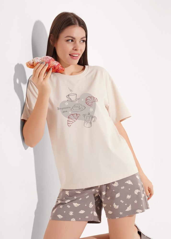 Описание Набор одежды из хлопкового трикотажного полотна. Футболка прямого кроя. Короткий втачной рукав. Округлая горловина с обтачкой. Спереди принт. Шорты с поясом на внутренней резинке. Боковые карманы с отрезным бочком, спереди нашивка. Состав: 100% Хлопок
