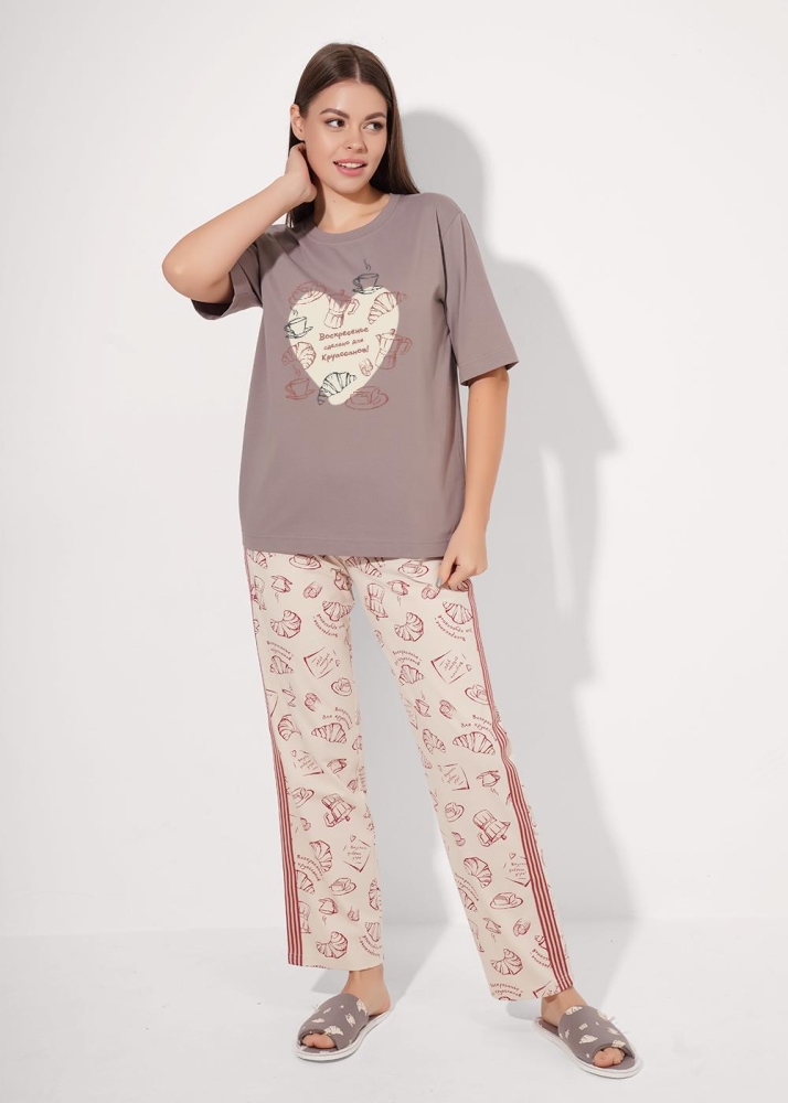 Описание Набор одежды для дома и отдыха из хлопкового трикотажного полотна. Футболка прямого кроя. Короткий втачной рукав. Округлая горловина с обтачкой. Спереди принт. Брюки с поясом на внутренней резинке, по боковому шву -лампас из тесьмы, спереди нашивка. Состав: 100% Хлопок