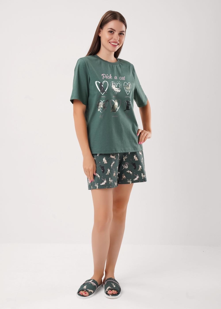 Описание Набор одежды из хлопкового трикотажного полотна. Футболка прямого кроя. Короткий втачной рукав. Округлая горловина с обтачкой. Спереди и по рукаву принт. Шорты с поясом на внутренней резинке. Боковые карманы с отрезным бочком и кантом Состав: 100% Хлопок