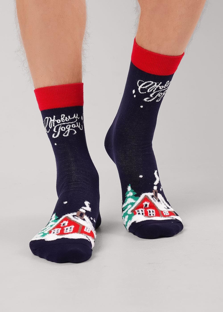 Носки мужские с рисунком дом в зимнем лесу, снег выполнен из пряжи травка, и надписью С Новым годом! Состав: 70% хлопок, 25% полиамид, 5% эластан