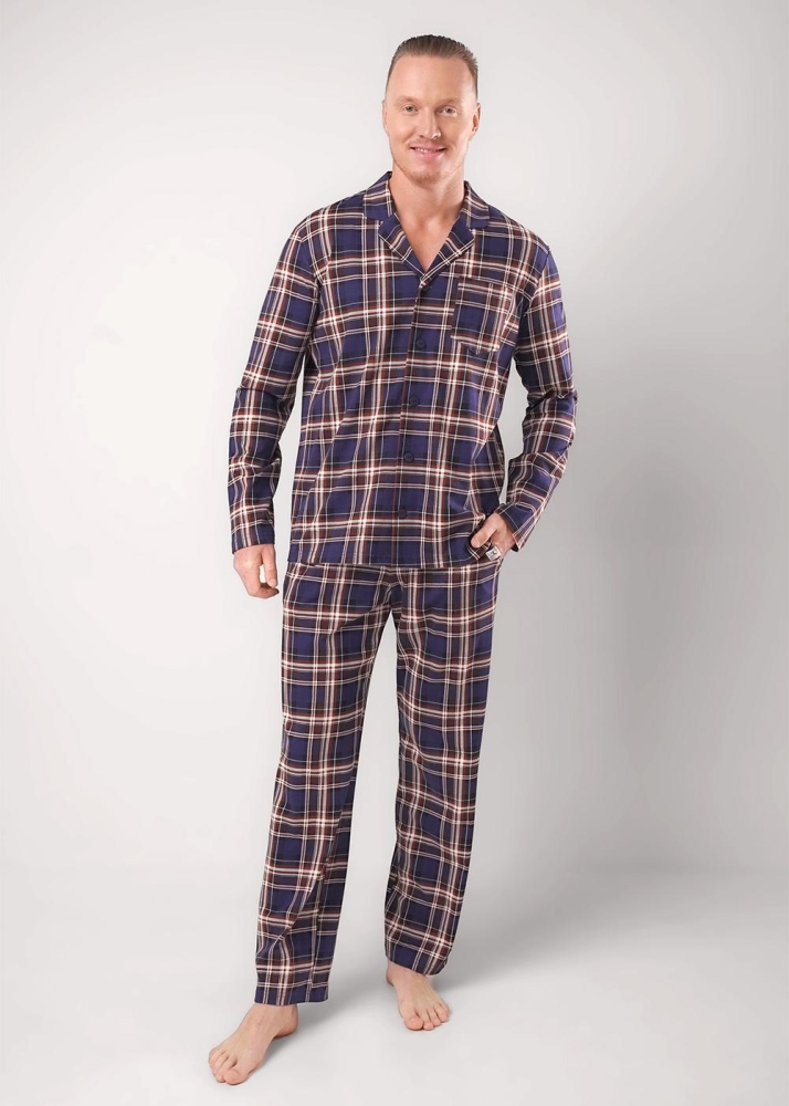 Описание: Пижама в оригинальную клетку из мягкого трикотажа с карбоном. Жакет с застежкой на пуговицы, отложным воротником и карманом. Прямые брюки с эластичным поясом, шнуром для регулировки по размеру и двумя функциональными карманами по бокам. Состав: 100% хлопок Страна: РОССИЯ