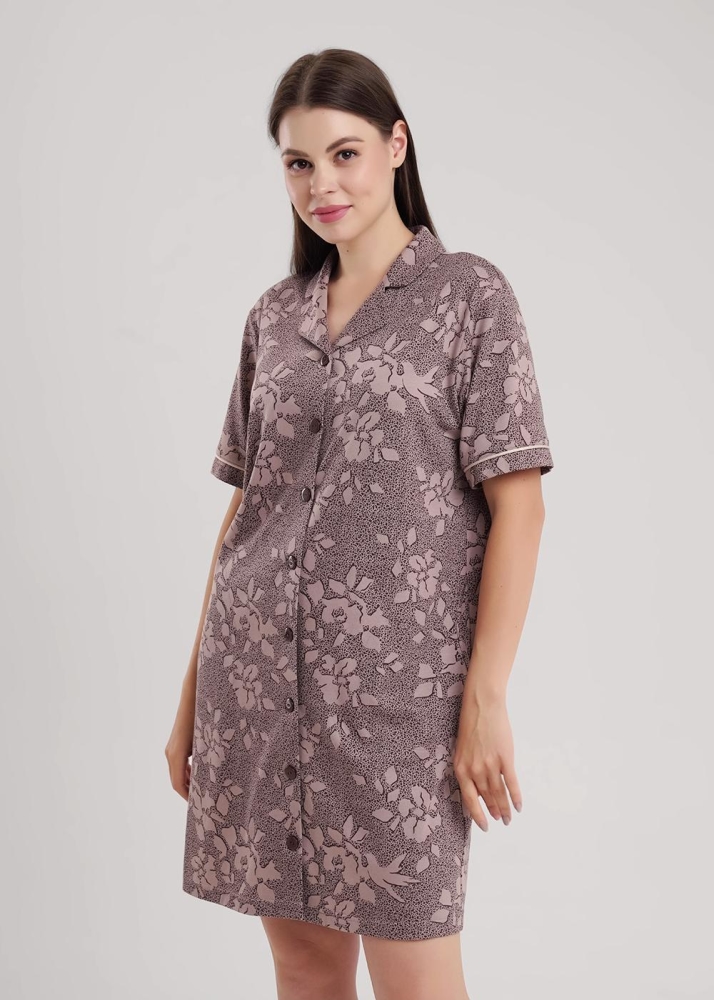 Описание: Платье для дома и отдыха из трикотажного полотна с добавлением модала, прямого силуэта с застежкой на пуговицы. Втачной короткий рукав, по низу рукава манжет с кантом. По горловине воротник с лацканами. Боковые карманы с окантовкой. Состав: 51% модал, 49% хлопок Страна: РОССИЯ