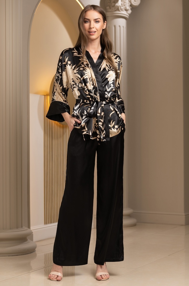 Брючный комплект-тройка Mia-Amore состоит из жакета с длинным рукавом, топа на тонких бретелях и широких брюк. Комплект выполнен из принтованного смесового шелка с однотонной отделкой. Жакет и топ выполнены из принтованного смесового шелка с однотонной отделкой, а брюки – из однотонного смесового шелка. По бокам брюк обработаны карманы. Линию талии жакета можно подчеркнуть за счет пояса, который идет в комплекте. Состав: 70% натуральный шелк, 25% полиэстер, 5% эластан