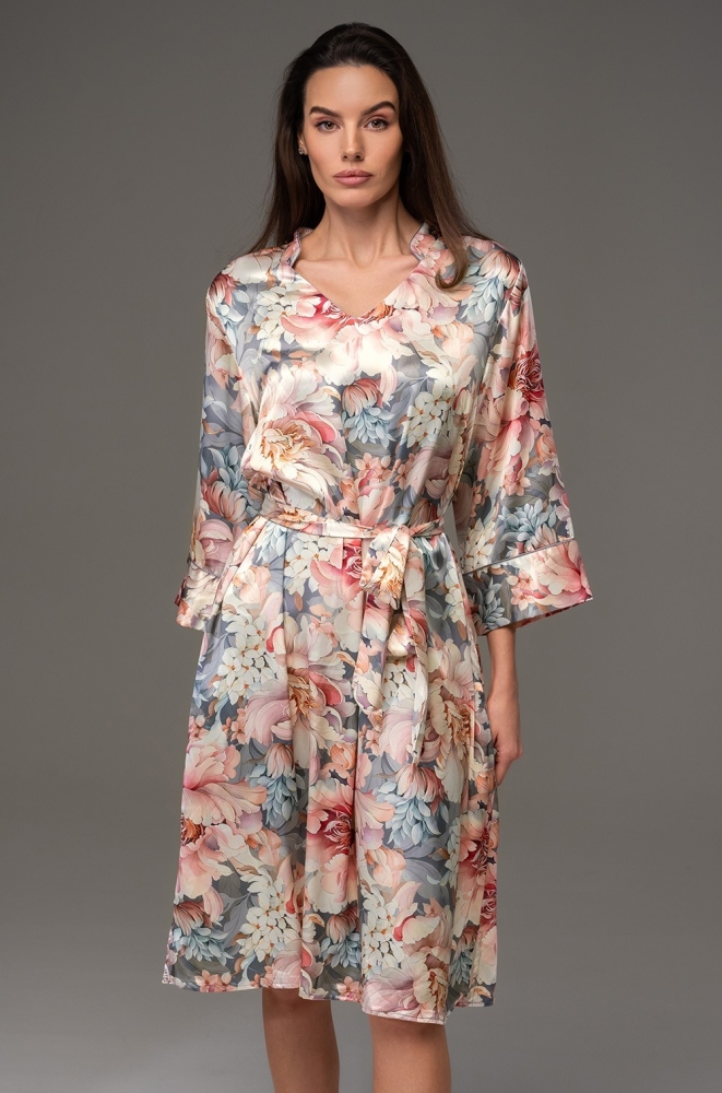 Туника Mia-Amore свободного силуэта, длиной ниже колен, с длиной рукавов 7/8, выполнена из принтованного смесового шелка. V-образная горловина с декоративной стойкой. Широкие притачные манжеты рукавов и декоративная стойка декорированы тонким изящным кантом. В боковых швах карманы. В комплекте идет пояс, чтобы приталить силуэт туники и подчеркнуть элегантный образ. Состав: 70% натуральный шелк, 25% полиэстер, 5% эластан