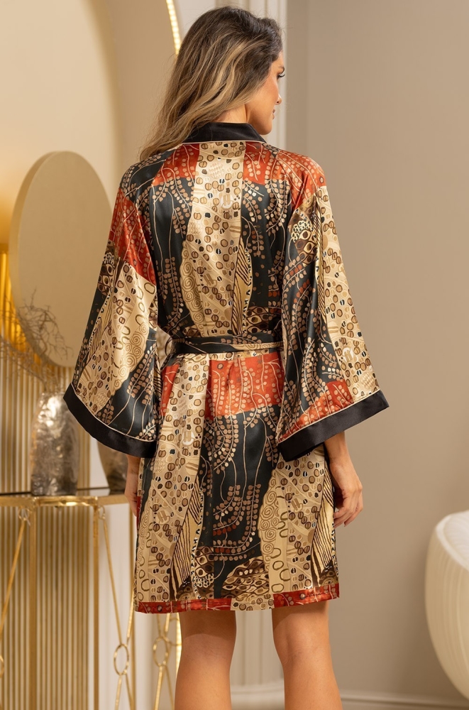Короткий запашной халат Mia-Amore с широким длинным рукавом. Изделие выполнено из принтованного смесового шелка с однотонной отделкой по бортам и низу рукавов. По бокам расположены карманы. Состав: 70% натуральный шелк, 25% полиэстер, 5% эластан