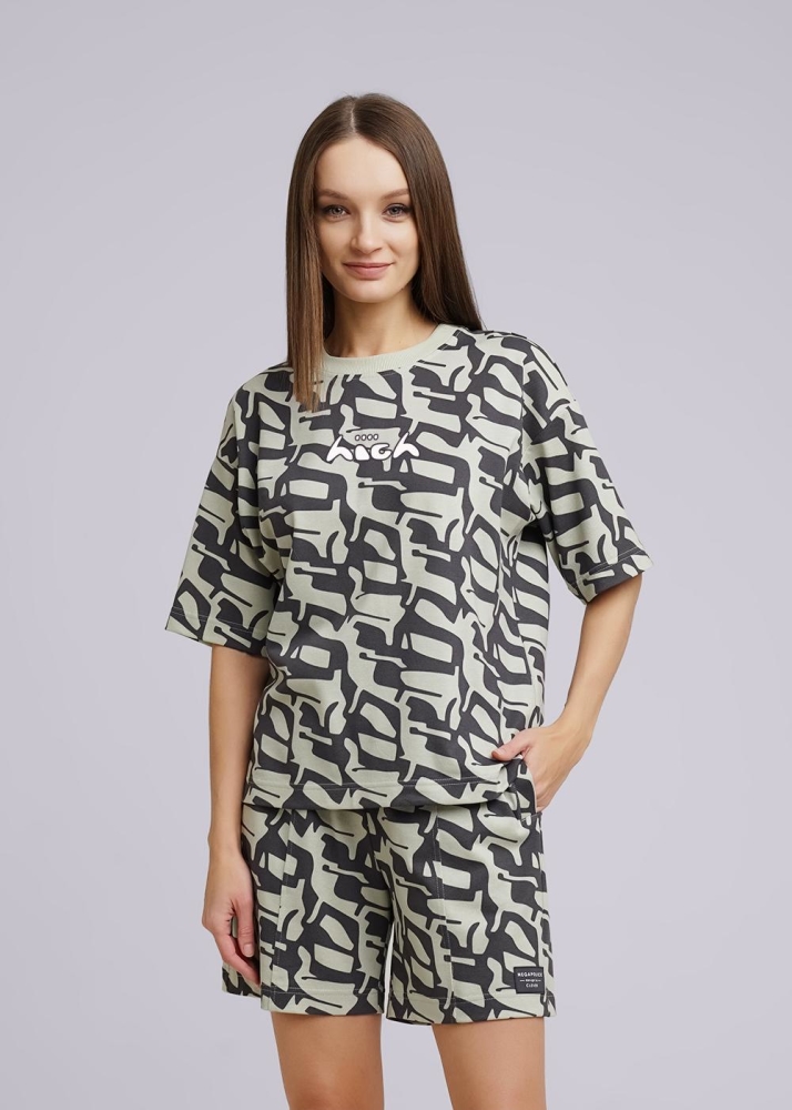 Комплект для дома из трикотажного полотна-пике. Джемпер со спущенной линией плеча, короткий рукав.Округлая горловина с обтачкой, принт. Шорты с поясом на резинке и со шнуром, по переду и спинке вертикальные резы, карманы листочка в боковых швах, нашивка. Состав: 56% хлопок, 44% полиэстер