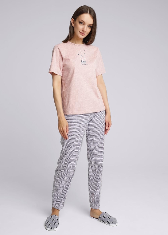 Комплект для дома из хлопкового трикотажного полотна с карбоном. Джемпер с втачным коротким рукавом. Круглой горловиной. По переду принт. По низу жаккардовая нашивка. Брюки с поясом на внутренней резинке. По низу манжеты на резинке. Состав: 100% хлопок